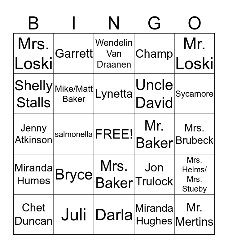 This bingo card has a free space and 24 words: Bryce, Juli, Lynetta, Chet Duncan, Mr. Loski, Mrs. Loski, Shelly Stalls, Garrett, Mr. Baker, Mrs. Baker, Uncle David, Jenny Atkinson, Jon Trulock, Mrs. Helms/ Mrs. Stueby, Mike/Matt Baker, Miranda Hughes, Mrs. Brubeck, Wendelin Van Draanen, Sycamore, salmonella, Mr. Mertins, Miranda Humes, Champ and Darla.