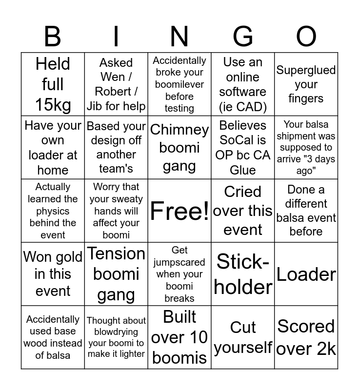 This bingo card has a free space and 24 words: Accidentally used base wood instead of balsa, Tension boomi gang, Chimney boomi gang, Cut yourself, Superglued your fingers, Held full 15kg, Asked Wen / Robert / Jib for help, Accidentally broke your boomilever before testing, Cried over this event, Done a different balsa event before, Actually learned the physics behind the event, Based your design off another team's, Stick-holder, Loader, Have your own loader at home, Thought about blowdrying your boomi to make it lighter, Built over 10 boomis, Use an online software (ie CAD), Your balsa shipment was supposed to arrive "3 days ago", Won gold in this event, Worry that your sweaty hands will affect your boomi, Get jumpscared when your boomi breaks, Believes SoCal is OP bc CA Glue and Scored over 2k.