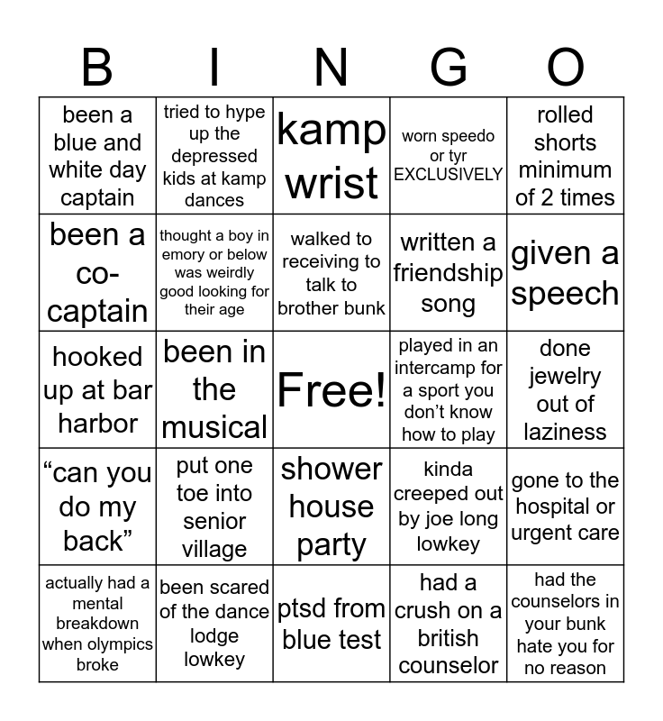 This bingo card has a free space and 24 words: put one toe into senior village, been scared of the dance lodge lowkey, walked to receiving to talk to brother bunk, actually had a mental breakdown when olympics broke, rolled shorts minimum of 2 times, been a blue and white day captain, been a co-captain, tried to hype up the depressed kids at kamp dances, played in an intercamp for a sport you don’t know how to play, shower house party, written a friendship song, hooked up at bar harbor, kinda creeped out by joe long lowkey, gone to the hospital or urgent care, thought a boy in emory or below was weirdly good looking for their age, had a crush on a british counselor, done jewelry out of laziness, kamp wrist, given a speech, been in the musical, had the counselors in your bunk hate you for no reason, “can you do my back”, worn speedo or tyr EXCLUSIVELY and ptsd from blue test.