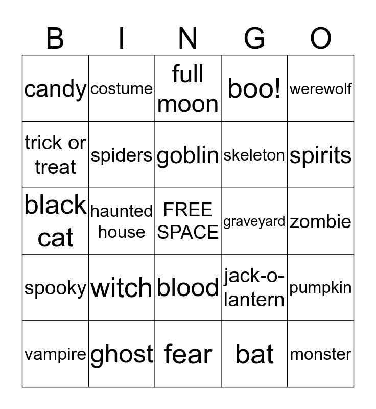 This bingo card has a free space and 24 words: witch, ghost, goblin, vampire, werewolf, candy, trick or treat, costume, graveyard, blood, skeleton, black cat, jack-o-lantern, pumpkin, spiders, bat, zombie, full moon, spirits, haunted house, monster, spooky, boo! and fear.