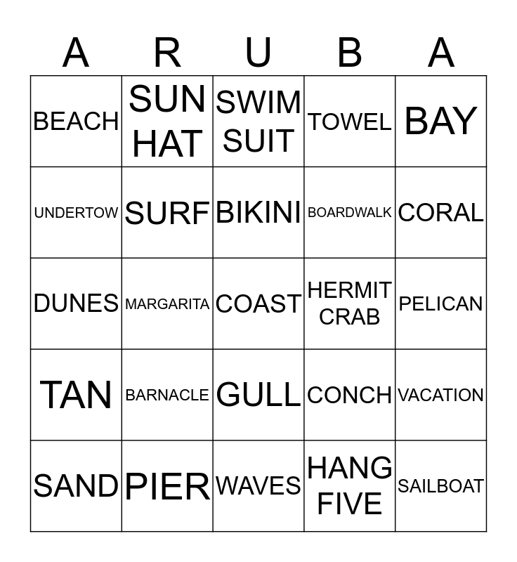 This bingo card has a free space and 24 words: BARNACLE, PIER, BIKINI, SAND, BAY, BEACH, UNDERTOW, SUN HAT, HERMIT CRAB, GULL, BOARDWALK, DUNES, CONCH, VACATION, SURF, HANG FIVE, PELICAN, SWIM SUIT, CORAL, MARGARITA, SAILBOAT, TAN, TOWEL and WAVES.