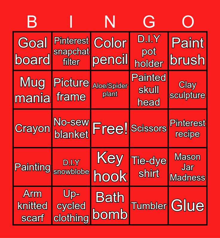 This bingo card has a free space and 24 words: D.I.Y snowblobe, Up-cycled clothing, Aloe/Spider plant, Arm knitted scarf, Paint brush, Goal board, Mug mania, Pinterest snapchat filter, Scissors, Key hook, Painted skull head, Crayon, Tie-dye shirt, Mason Jar Madness, Picture frame, Tumbler, Pinterest recipe, Color pencil, Clay sculpture, No-sew blanket, Glue, Painting, D.I.Y pot holder and Bath bomb.