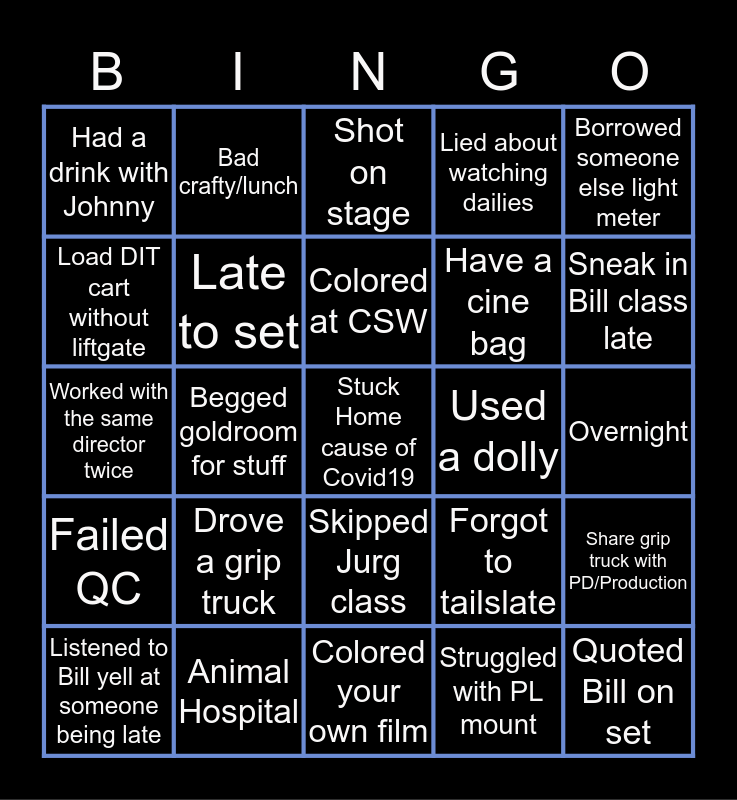 This bingo card has a free space and 24 words: Listened to Bill yell at someone being late, Drove a grip truck, Colored at CSW, Struggled with PL mount, Borrowed someone else light meter, Had a drink with Johnny, Bad crafty/lunch, Shot on stage, Used a dolly, Overnight, Worked with the same director twice, Late to set, Forgot to tailslate, Share grip truck with PD/Production, Load DIT cart without liftgate, Animal Hospital, Colored your own film, Lied about watching dailies, Sneak in Bill class late, Failed QC, Begged goldroom for stuff, Skipped Jurg class, Have a cine bag and Quoted Bill on set.