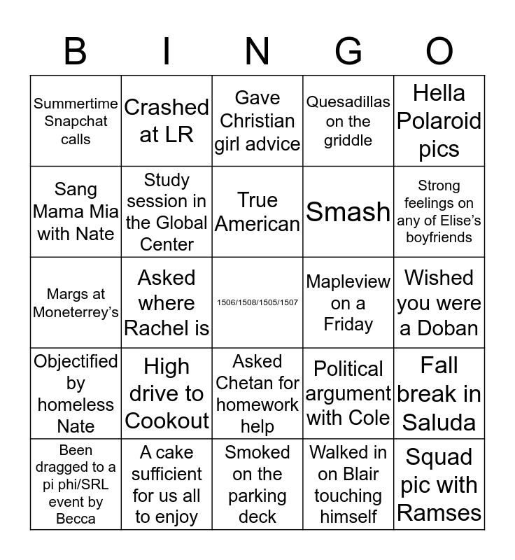 This bingo card has a free space and 24 words: High drive to Cookout, A cake sufficient for us all to enjoy, True American, Been dragged to a pi phi/SRL event by Becca, Hella Polaroid pics, Summertime Snapchat calls, Sang Mama Mia with Nate, Crashed at LR, Mapleview on a Friday, Asked Chetan for homework help, Smash, Margs at Moneterrey’s, Political argument with Cole, Fall break in Saluda, Study session in the Global Center, Walked in on Blair touching himself, Wished you were a Doban, Gave Christian girl advice, Strong feelings on any of Elise’s boyfriends, Asked where Rachel is, Squad pic with Ramses, Objectified by homeless Nate, Quesadillas on the griddle and Smoked on the parking deck.