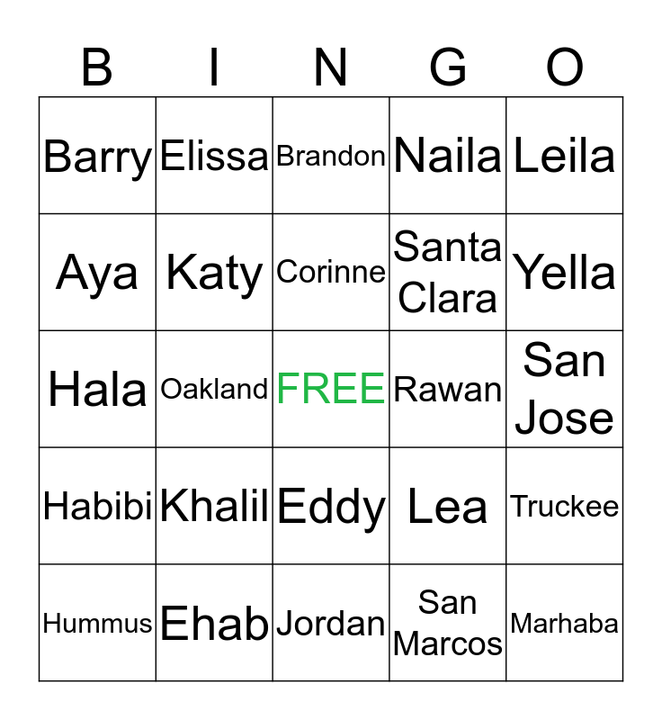 This bingo card has a free space and 24 words: Khalil, Ehab, Corinne, Hummus, Leila, Barry, Aya, Elissa, Rawan, Eddy, Santa Clara, Hala, Lea, Truckee, Katy, San Marcos, San Jose, Brandon, Yella, Oakland, Marhaba, Habibi, Naila and Jordan.