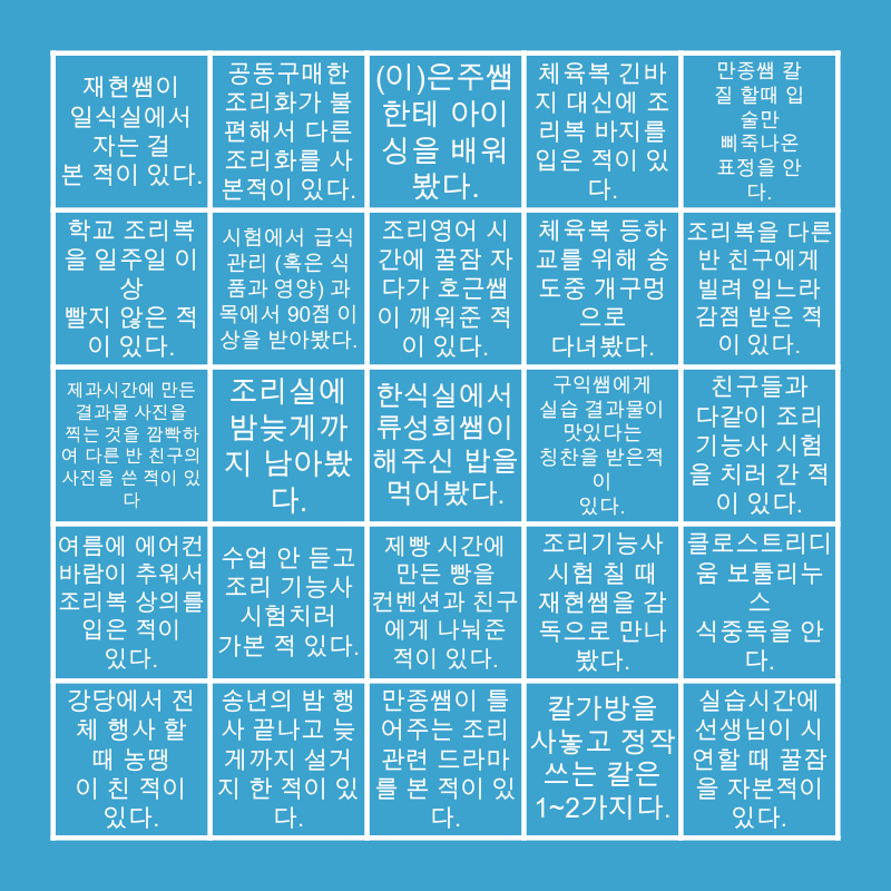 This bingo card has a free space and 24 words: 수업 안 듣고 조리 기능사 시험치러 가본 적 있다., 송년의 밤 행사 끝나고 늦게까지 설거지 한 적이 있다., 조리영어 시간에 꿀잠 자다가 호근쌤이 깨워준 적이 있다., 강당에서 전체 행사 할 때 농땡이 친 적이 있다., 만종쌤 칼 질 할때 입술만 삐죽나온 표정을 안다., 재현쌤이 일식실에서 자는 걸 본 적이 있다., 학교 조리복을 일주일 이상 빨지 않은 적이 있다., 공동구매한 조리화가 불편해서 다른 조리화를 사 본적이 있다., 구익쌤에게 실습 결과물이 맛있다는 칭찬을 받은적이 있다., 제빵 시간에 만든 빵을 컨벤션과 친구에게 나눠준 적이 있다., 체육복 등하교를 위해 송도중 개구멍으로 다녀봤다., 제과시간에 만든 결과물 사진을 찍는 것을 깜빡하여 다른 반 친구의 사진을 쓴 적이 있다, 조리기능사 시험 칠 때 재현쌤을 감독으로 만나봤다., 클로스트리디움 보툴리누스 식중독을 안다., 시험에서 급식관리 (혹은 식품과 영양) 과목에서 90점 이상을 받아봤다., 칼가방을 사놓고 정작 쓰는 칼은 1~2가지다., 친구들과 다같이 조리기능사 시험을 치러 간 적이 있다., (이)은주쌤한테 아이싱을 배워봤다., 조리복을 다른 반 친구에게 빌려 입느라 감점 받은 적이 있다., 조리실에 밤늦게까지 남아봤다., 실습시간에 선생님이 시연할 때 꿀잠을 자본적이 있다., 여름에 에어컨 바람이 추워서 조리복 상의를 입은 적이 있다., 체육복 긴바지 대신에 조리복 바지를 입은 적이 있다. and 만종쌤이 틀어주는 조리 관련 드라마를 본 적이 있다..