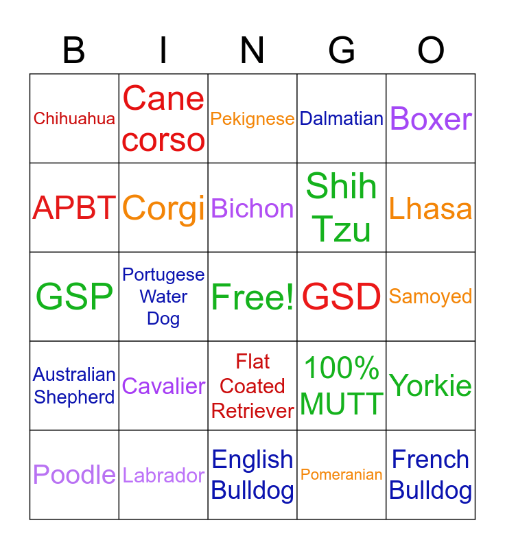 This bingo card has a free space and 24 words: Cavalier, Labrador, Bichon, Poodle, Boxer, Chihuahua, APBT, Cane corso, GSD, Flat Coated Retriever, Shih Tzu, GSP, 100% MUTT, Yorkie, Corgi, Pomeranian, Samoyed, Pekignese, Lhasa, Portugese Water Dog, French Bulldog, Australian Shepherd, Dalmatian and English Bulldog.