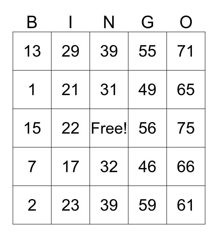 This bingo card has a free space and 24 words: 2, 17, 31, 59, 71, 13, 29, 39, 56, 75, 15, 21, 46, 66, 1, 23, 39, 55, 65, 7, 22, 32, 49 and 61.