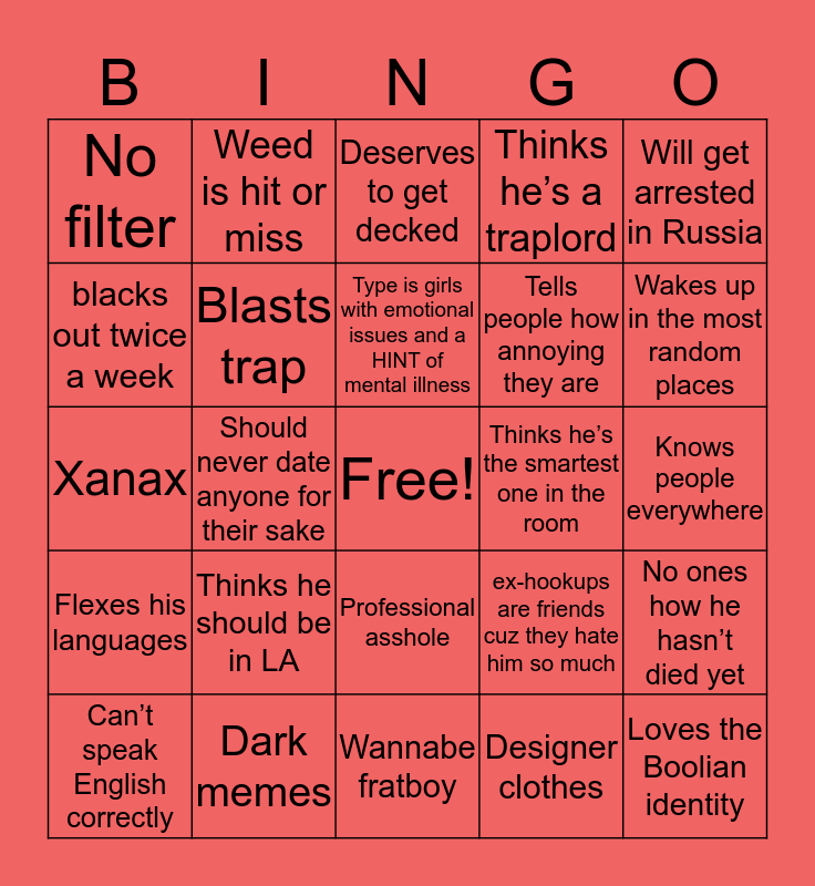 This bingo card has a free space and 24 words: Thinks he should be in LA, Dark memes, Type is girls with emotional issues and a HINT of mental illness, Can’t speak English correctly, Will get arrested in Russia, No filter, blacks out twice a week, Weed is hit or miss, Thinks he’s the smartest one in the room, Professional asshole, Tells people how annoying they are, Xanax, ex-hookups are friends cuz they hate him so much, No ones how he hasn’t died yet, Blasts trap, Designer clothes, Knows people everywhere, Deserves to get decked, Wakes up in the most random places, Should never date anyone for their sake, Loves the Boolian identity, Flexes his languages, Thinks he’s a traplord and Wannabe fratboy.