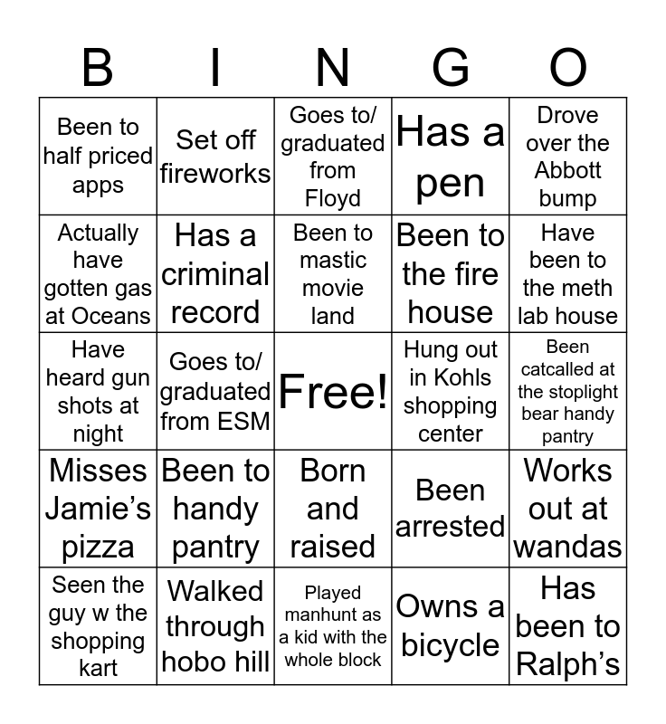 This bingo card has a free space and 24 words: Been to handy pantry, Walked through hobo hill, Been to mastic movie land, Seen the guy w the shopping kart, Drove over the Abbott bump, Been to half priced apps, Actually have gotten gas at Oceans, Set off fireworks, Hung out in Kohls shopping center, Born and raised, Been to the fire house, Have heard gun shots at night, Been arrested, Works out at wandas, Has a criminal record, Owns a bicycle, Been catcalled at the stoplight bear handy pantry, Goes to/ graduated from Floyd, Have been to the meth lab house, Goes to/ graduated from ESM, Has been to Ralph’s, Misses Jamie’s pizza, Has a pen and Played manhunt as a kid with the whole block.