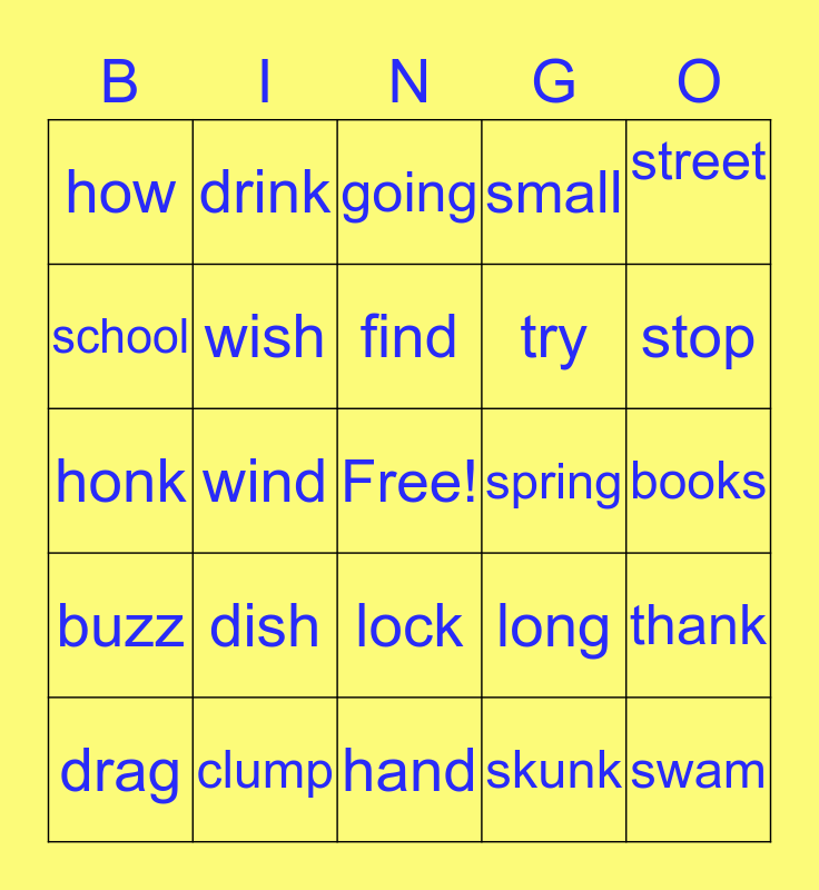 This bingo card has a free space and 24 words: dish, clump, find, drag, street, how, school, drink, spring, lock, try, honk, long, thank, wish, skunk, books, going, stop, wind, swam, buzz, small and hand.
