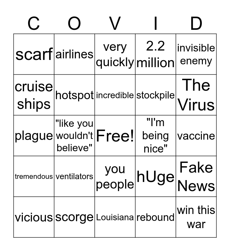 This bingo card has a free space and 30 words: scorge, slow the spread, "like you wouldn't believe", talented people, scarf, very quickly, hotspot, you people, "I'm being nice", Louisiana, vaccine, win this war, rebound, CHINA, The Virus, The Model, hUge, tremendous, ventilators, invisible enemy, plague, mitigation, airlines, stockpile, cruise ships, 2.2 million, Fake News, vicious, incredible and brilliant.