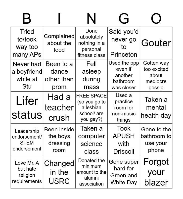 This bingo card has a free space and 24 words: Been inside the boys dressing room, Changed in the USRC, Fell asleep during mass, Love Mr. A but hate religion requirements, Gouter, Tried to/took way too many APs, Never had a boyfriend while at Stu, Complained about the food, Used a practice room for non-music things, Taken a computer science class, Used the ppp even if another bathroom was closer, Lifer status, Took APUSH with Driscoll, Gone to the bathroom to use your phone, Been to a dance other than prom, Gone super hard for Green and White Day, Taken a mental health day, Done absolutely nothing in a personal fitness class, Gotten way too excited about mediocre gossip, Had a teacher crush, Forgot your blazer, Leadership endorsement/ STEM endorsement, Said you’d never go to Princeton and Donated the minimum amount to the alumni association.