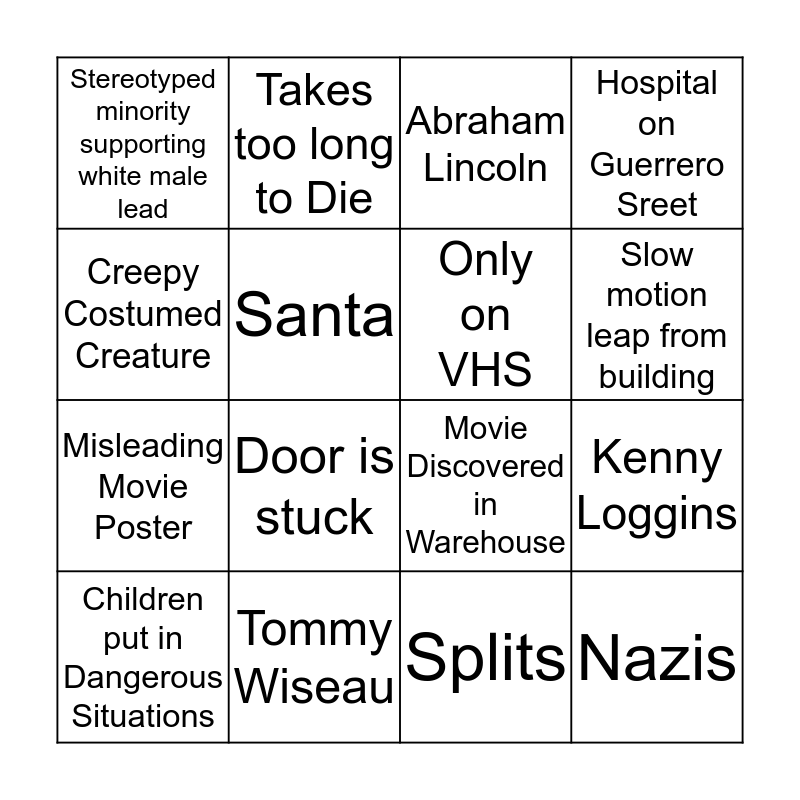 This bingo card has 23 words: Nazis, Bad Acting, Slow motion leap from building, Unnecessary use of green screen, Creepy Costumed Creature, Stereotyped minority supporting white male lead, Santa, Takes too long to Die, Children put in Dangerous Situations, Movie chopped up to make another movie, Door is stuck, Misleading Movie Poster, Montage, Swift hit to the nuts, Tommy Wiseau, Reused Footage, Abraham Lincoln, Movie Discovered in Warehouse, Only on VHS, Kenny Loggins, Hospital on Guerrero Sreet, Splits and Awkward wink.