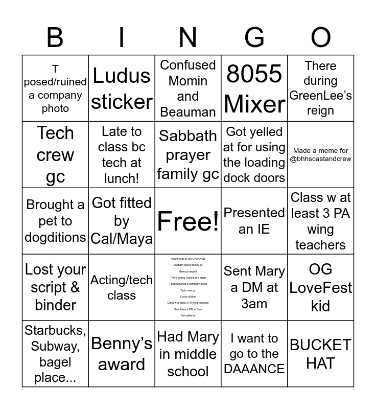 This bingo card has a free space and 26 words: I want to go to the DAAANCE Sabbath prayer family gc Benny’s award There during GreenLee’s reign T posed/ruined a company photo Tech crew gc Ludus sticker Class w at least 3 PA wing teachers Sent Mary a DM at 3am Got yelled at, I want to go to the DAAANCE, Sabbath prayer family gc, Benny’s award, There during GreenLee’s reign, T posed/ruined a company photo, Tech crew gc, Ludus sticker, Class w at least 3 PA wing teachers, Sent Mary a DM at 3am, Got yelled at for using the loading dock doors, Brought a pet to dogditions, OG LoveFest kid, Starbucks, Subway, bagel place..., Got fitted by Cal/Maya, Came in the summer to fix the spot booth, 8055 Mixer, Lost your script & binder, Confused Momin and Beauman, BUCKET HAT, Made a meme for @bhhscastandcrew, Had Mary in middle school, Presented an IE, Acting/tech class, Late to class bc tech at lunch! and Interrupted Mary’s class for an advisory pass.
