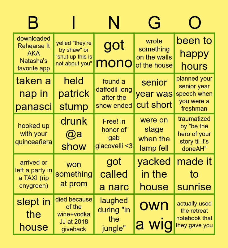 This bingo card has a free space and 24 words: slept in the house, won something at prom, found a daffodil long after the show ended, own a wig, been to happy hours, downloaded Rehearse It AKA Natasha's favorite app, yelled "they're by shaw" or "shut up this is not about you", got mono, were on stage when the lamp fell, traumatized by "be the hero of your story til it's doneAH", hooked up with your quinceañera, held patrick stump, yacked in the house, made it to sunrise, taken a nap in panasci, died because of the wine+vodka JJ at 2018 giveback, laughed during "in the jungle", wrote something on the walls of the house, planned your senior year speech when you were a freshman, arrived or left a party in a TAXI (rip cnygreen), drunk @a show, got called a narc, senior year was cut short and actually used the retreat notebook that they gave you.