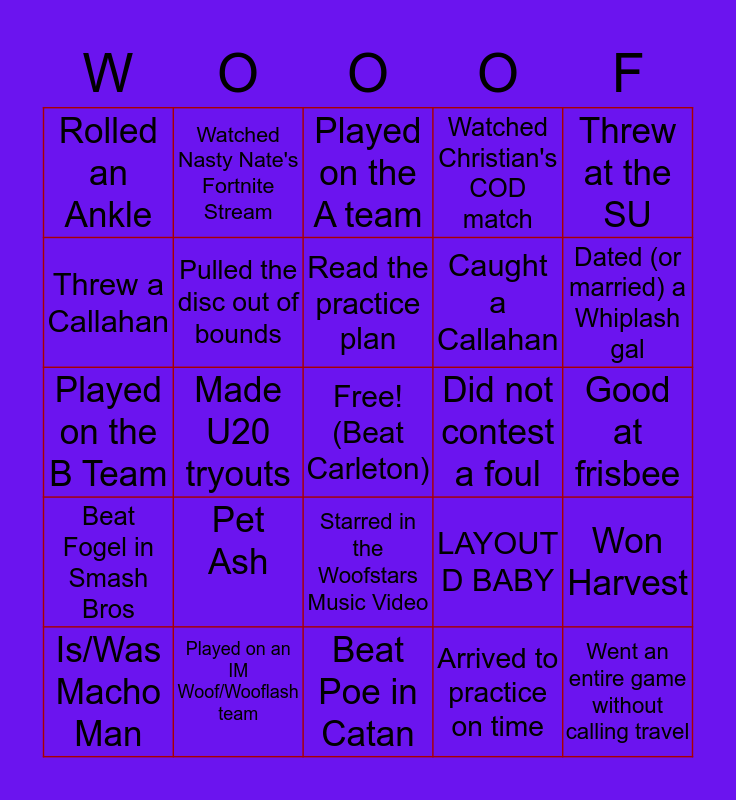 This bingo card has a free space and 24 words: Pet Ash, Played on an IM Woof/Wooflash team, Read the practice plan, Is/Was Macho Man, Threw at the SU, Rolled an Ankle, Threw a Callahan, Watched Nasty Nate's Fortnite Stream, Did not contest a foul, Starred in the Woofstars Music Video, Caught a Callahan, Played on the B Team, LAYOUT D BABY, Won Harvest, Pulled the disc out of bounds, Arrived to practice on time, Good at frisbee, Played on the A team, Dated (or married) a Whiplash gal, Made U20 tryouts, Went an entire game without calling travel, Beat Fogel in Smash Bros, Watched Christian's COD match and Beat Poe in Catan.