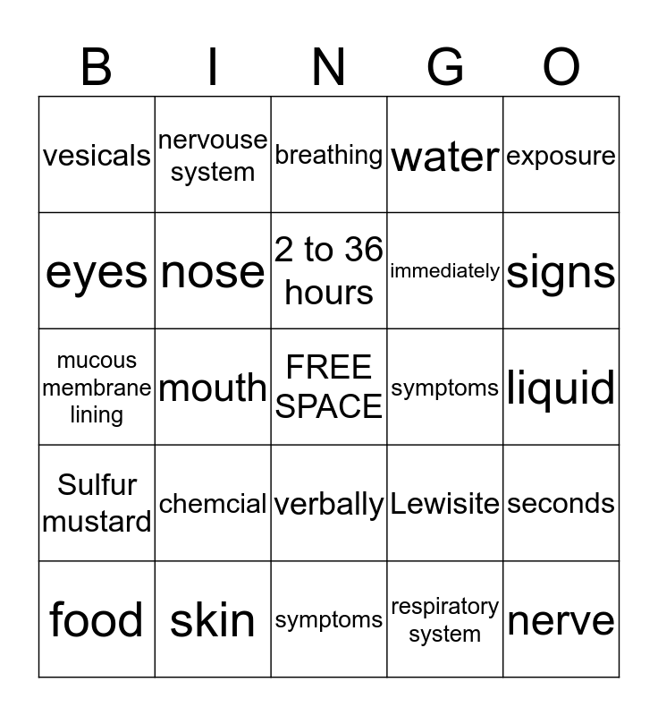 This bingo card has a free space and 24 words: chemcial, skin, 2 to 36 hours, food, exposure, vesicals, eyes, nervouse system, symptoms, verbally, immediately, mucous membrane lining, Lewisite, seconds, nose, respiratory system, liquid, breathing, signs, mouth, nerve, Sulfur mustard, water and symptoms.