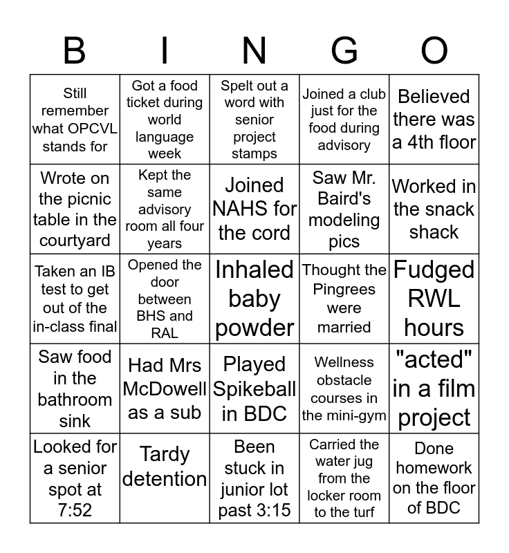This bingo card has a free space and 24 words: Had Mrs McDowell as a sub, Tardy detention, Joined NAHS for the cord, Looked for a senior spot at 7:52, Believed there was a 4th floor, Still remember what OPCVL stands for, Wrote on the picnic table in the courtyard, Got a food ticket during world language week, Thought the Pingrees were married, Played Spikeball in BDC, Saw Mr. Baird's modeling pics, Taken an IB test to get out of the in-class final, Wellness obstacle courses in the mini-gym, "acted" in a film project, Kept the same advisory room all four years, Carried the water jug from the locker room to the turf, Fudged RWL hours, Spelt out a word with senior project stamps, Worked in the snack shack, Opened the door between BHS and RAL, Done homework on the floor of BDC, Saw food in the bathroom sink, Joined a club just for the food during advisory and Been stuck in junior lot past 3:15.