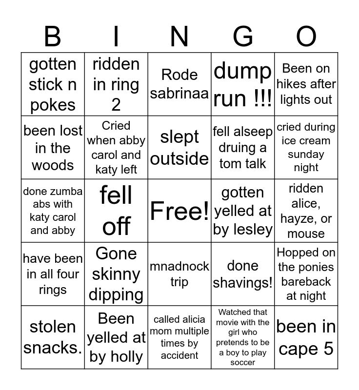 This bingo card has a free space and 24 words: Gone skinny dipping, Been yelled at by holly, slept outside, stolen snacks., Been on hikes after lights out, gotten stick n pokes, been lost in the woods, ridden in ring 2, gotten yelled at by lesley, mnadnock trip, fell alseep druing a tom talk, done zumba abs with katy carol and abby, done shavings!, Hopped on the ponies bareback at night, Cried when abby carol and katy left, Watched that movie with the girl who pretends to be a boy to play soccer, ridden alice, hayze, or mouse, Rode sabrinaa, cried during ice cream sunday night, fell off, been in cape 5, have been in all four rings, dump run !!! and called alicia mom multiple times by accident.