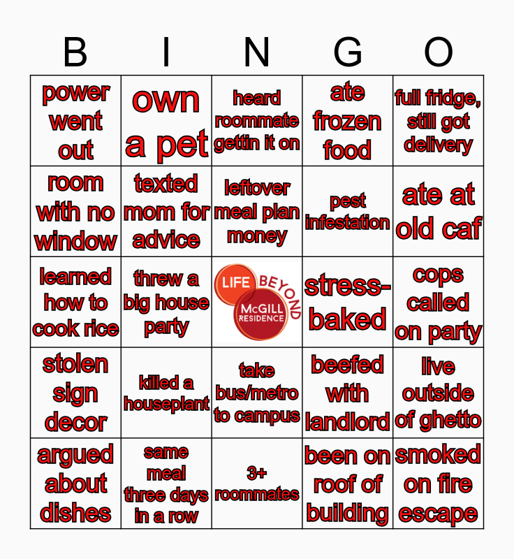 This bingo card has a free space and 24 words: argued about dishes, killed a houseplant, leftover meal plan money, been on roof of building, full fridge, still got delivery, power went out, own a pet, heard roommate gettin it on, stress-baked, cops called on party, learned how to cook rice, texted mom for advice, beefed with landlord, live outside of ghetto, room with no window, same meal three days in a row, 3+ roommates, ate frozen food, ate at old caf, stolen sign decor, threw a big house party, take bus/metro to campus, pest infestation and smoked on fire escape.