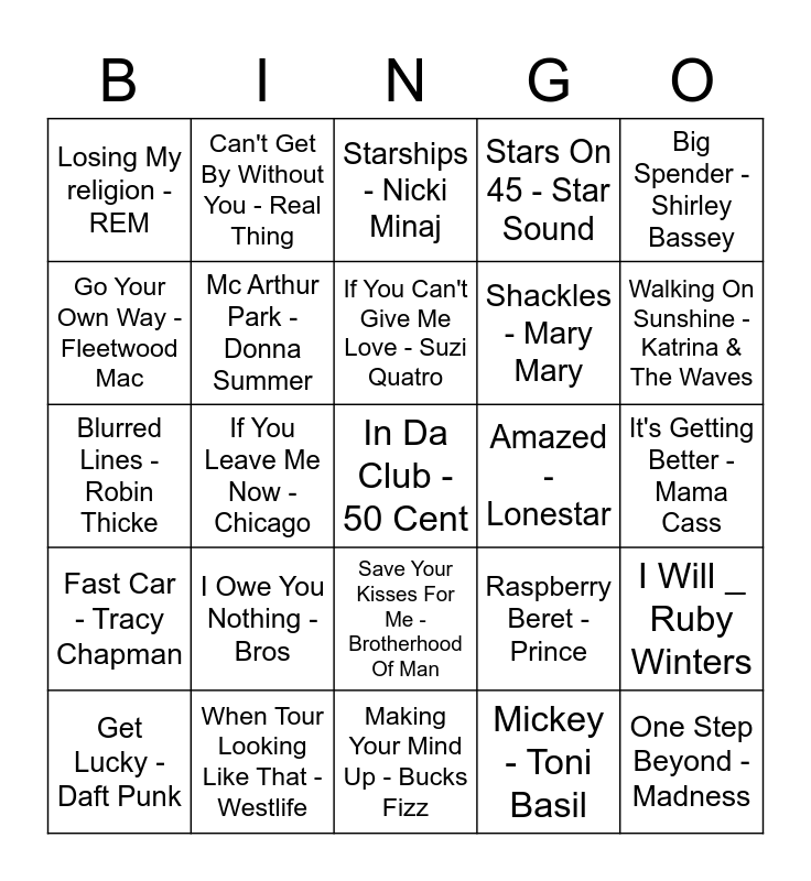 This bingo card has 43 words: Im In The Mood For Dancing - Nolan Sisters, In Da Club - 50 Cent, Smooth - Santana, Get Lucky - Daft Punk, Let Your love Flow - Bellamy Brothers, Mickey - Toni Basil, Starships - Nicki Minaj, Got To get You Into My Life - Beatles, Big Spender - Shirley Bassey, When Tour Looking Like That - Westlife, Stars On 45 - Star Sound, Amazed - Lonestar, Save Your Kisses For Me - Brotherhood Of Man, I Owe You Nothing - Bros, Dance Yourself Dizzy - Liqued Gold, Making Your Mind Up - Bucks Fizz, So Macho - Sinitta, Blurred Lines - Robin Thicke, Haven't Stopped Dancing Yet - Gonzalez, Walking On Sunshine - Katrina & The Waves, Can't Get By Without You - Real Thing, Wake Me Up - Avicii, Cant Take My Eyes Off You - Andy Williams, Losing My religion - REM, Fame - Irene Care, It's Getting Better - Mama Cass, Don't Call Me Babe - Madison Avenue, Be My Baby - The Ronattes, Raspberry Beret - Prince, Fast Car - Tracy Chapman, Love Of My Life - Dooleys, I Will _ Ruby Winters, Turn Me On - Kevin Lyttle, If You Leave Me Now - Chicago, You Spin Me Around - Dead Or Alive, I Follow Rivers - Lykke Li, One Step Beyond - Madness, If You Can't Give Me Love - Suzi Quatro, Go Your Own Way - Fleetwood Mac, Shackles - Mary Mary, You've Got Your Troubles - Fortunes, Mc Arthur Park - Donna Summer and Halfway To Paradise - Billy Fury.