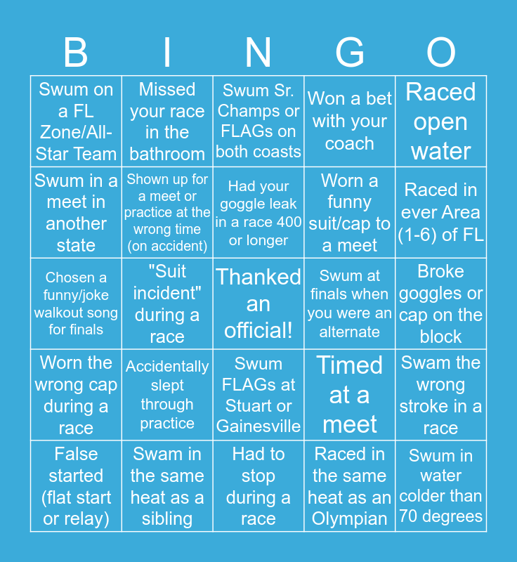 This bingo card has a free space and 24 words: Accidentally slept through practice, Swam in the same heat as a sibling, Had your goggle leak in a race 400 or longer, False started (flat start or relay), Raced open water, Swum on a FL Zone/All-Star Team, Swum in a meet in another state, Missed your race in the bathroom, Swum at finals when you were an alternate, Swum FLAGs at Stuart or Gainesville, Worn a funny suit/cap to a meet, Chosen a funny/joke walkout song for finals, Timed at a meet, Swam the wrong stroke in a race, Shown up for a meet or practice at the wrong time (on accident), Raced in the same heat as an Olympian, Broke goggles or cap on the block, Swum Sr. Champs or FLAGs on both coasts, Raced in ever Area (1-6) of FL, "Suit incident" during a race, Swum in water colder than 70 degrees, Worn the wrong cap during a race, Won a bet with your coach and Had to stop during a race.