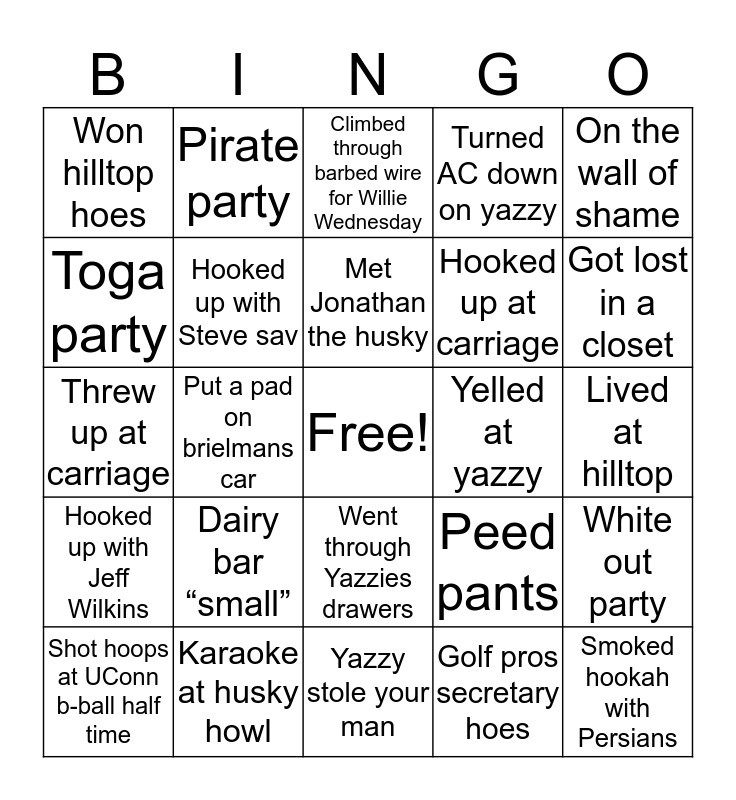 This bingo card has a free space and 24 words: Dairy bar “small”, Karaoke at husky howl, Met Jonathan the husky, Shot hoops at UConn b-ball half time, On the wall of shame, Won hilltop hoes, Toga party, Pirate party, Yelled at yazzy, Went through Yazzies drawers, Hooked up at carriage, Threw up at carriage, Peed pants, White out party, Hooked up with Steve sav, Golf pros secretary hoes, Lived at hilltop, Climbed through barbed wire for Willie Wednesday, Got lost in a closet, Put a pad on brielmans car, Smoked hookah with Persians, Hooked up with Jeff Wilkins, Turned AC down on yazzy and Yazzy stole your man.