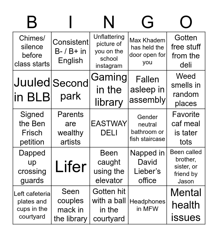 This bingo card has a free space and 24 words: Lifer, Seen couples mack in the library, Gaming in the library, Left cafeteria plates and cups in the courtyard, Gotten free stuff from the deli, Chimes/ silence before class starts, Juuled in BLB, Consistent B- / B+ in English, Gender neutral bathroom or fish staircase, Been caught using the elevator, Fallen asleep in assembly, Signed the Ben Frisch petition, Napped in David Lieber’s office, Been called brother, sister, or friend by Jason, Second park, Headphones in MFW, Favorite caf meal is tater tots, Unflattering picture of you on the school instagram, Weed smells in random places, Parents are wealthy artists, Mental health issues, Dapped up crossing guards, Max Khadem has held the door open for you and Gotten hit with a ball in the courtyard.