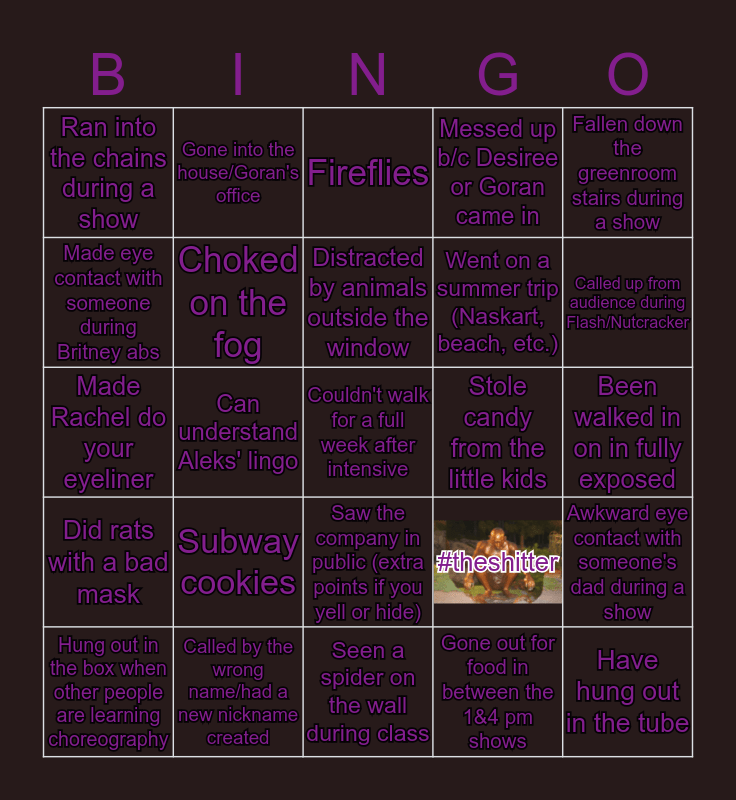 This bingo card has 1 images and 25 words: Subway cookies, Seen a spider on the wall during class, Distracted by animals outside the window, Hung out in the box when other people are learning choreography, Fallen down the greenroom stairs during a show, Ran into the chains during a show, Made eye contact with someone during Britney abs, Gone into the house/Goran's office, Stole candy from the little kids, Saw the company in public (extra points if you yell or hide), Went on a summer trip (Naskart, beach, etc.), Made Rachel do your eyeliner, #theshitter, Awkward eye contact with someone's dad during a show, Choked on the fog, Have hung out in the tube, Been walked in on in fully exposed, Fireflies, Called up from audience during Flash/Nutcracker, Can understand Aleks' lingo, Couldn't walk for a full week after intensive, Called by the wrong name/had a new nickname created, Did rats with a bad mask, Messed up b/c Desiree or Goran came in and Gone out for food in between the 1&4 pm shows.