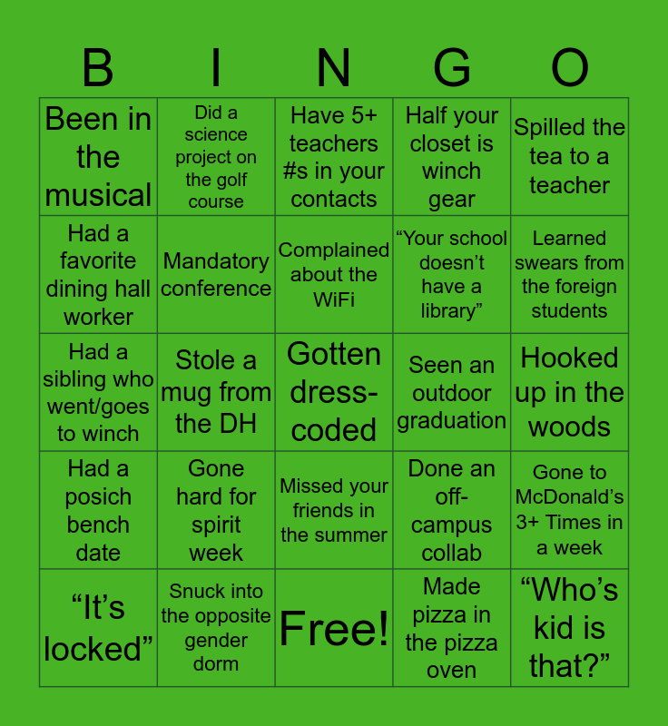 This bingo card has 25 words: Had a posich bench date, Snuck into the opposite gender dorm, Gotten dress-coded, Made pizza in the pizza oven, Spilled the tea to a teacher, Been in the musical, Did a science project on the golf course, Have 5+ teachers #s in your contacts, Seen an outdoor graduation, Gone to McDonald’s 3+ Times in a week, Had a favorite dining hall worker, Mandatory conference, Free!, Done an off-campus collab, Learned swears from the foreign students, “It’s locked”, Stole a mug from the DH, Complained about the WiFi, “Your school doesn’t have a library”, Hooked up in the woods, Had a sibling who went/goes to winch, Gone hard for spirit week, Missed your friends in the summer, Half your closet is winch gear and “Who’s kid is that?”.