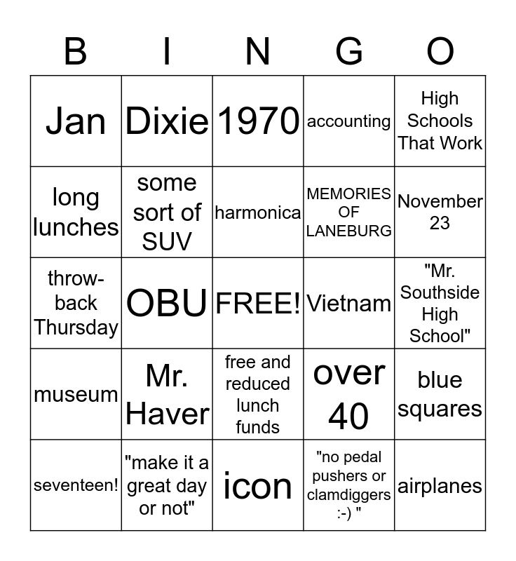 This bingo card has a free space and 24 words: Mr. Haver, "make it a great day or not", harmonica, seventeen!, High Schools That Work, Jan, long lunches, Dixie, Vietnam, free and reduced lunch funds, MEMORIES OF LANEBURG, throw-back Thursday, over 40, blue squares, some sort of SUV, "no pedal pushers or clamdiggers :-) ", "Mr. Southside High School", 1970, November 23, OBU, airplanes, museum, accounting and icon.