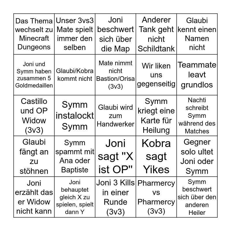 This bingo card has a free space and 24 words: Symm spammt mit Ana oder Baptiste, Joni behauptet gleich X zu spielen, spielt dann Y, Mate nimmt nicht Bastion/Orisa (3v3), Joni erzählt das er Widow nicht kann, Glaubi kennt einen Namen nicht, Das Thema wechselt zu Minecraft Dungeons, Joni und Symm haben zusammen 5 Goldmedaillen, Unser 3vs3 Mate spielt immer den selben, Symm kriegt eine Karte für Heilung, Joni sagt ''X ist OP'', Wir liken uns gegenseitig, Castillo und OP Widow (3v3), Kobra sagt Yikes, Gegner solo ultet Joni oder Symm, Glaubi/Kobra kommt nicht, Pharmercy vs Pharmercy (3v3), Nachti schreibt Symm während des Matches, Joni beschwert sich über die Map, Teammate leavt grundlos, Symm instalockt Symm, Symm beschwert sich über den anderen Heiler, Glaubi fängt an zu stöhnen, Anderer Tank geht nicht Schildtank and Joni 3 Kills in einer Runde (3v3).