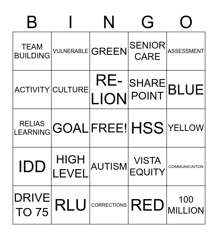 This bingo card has a free space and 24 words: HIGH LEVEL, RLU, RE-LION, DRIVE TO 75, ASSESSMENT, TEAM BUILDING, ACTIVITY, VULNERABLE, HSS, AUTISM, SHARE POINT, RELIAS LEARNING, VISTA EQUITY, COMMUNICAITON, CULTURE, RED, YELLOW, GREEN, BLUE, GOAL, 100 MILLION, IDD, SENIOR CARE and CORRECTIONS.
