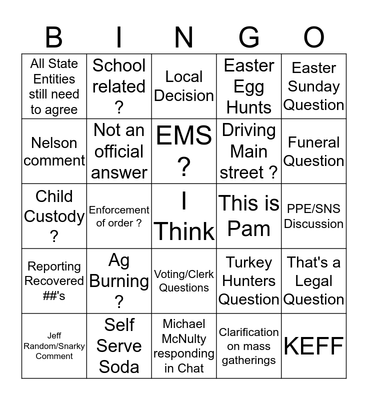 This bingo card has a free space and 24 words: Ag Burning ?, Self Serve Soda, EMS ?, Jeff Random/Snarky Comment, Easter Sunday Question, All State Entities still need to agree, Nelson comment, School related ?, This is Pam, Voting/Clerk Questions, Driving Main street ?, Child Custody ?, Turkey Hunters Question, That's a Legal Question, Not an official answer, Clarification on mass gatherings, PPE/SNS Discussion, Local Decision, Funeral Question, Enforcement of order ?, KEFF, Reporting Recovered ##'s, Easter Egg Hunts and Michael McNulty responding in Chat.