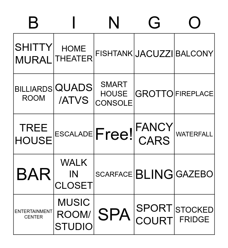 This bingo card has a free space and 24 words: WALK IN CLOSET, MUSIC ROOM/ STUDIO, SMART HOUSE CONSOLE, ENTERTAINMENT CENTER, BALCONY, SHITTY MURAL, BILLIARDS ROOM, HOME THEATER, FANCY CARS, SCARFACE, GROTTO, TREE HOUSE, BLING, GAZEBO, QUADS /ATVS, SPORT COURT, WATERFALL, FISHTANK, FIREPLACE, ESCALADE, STOCKED FRIDGE, BAR, JACUZZI and SPA.
