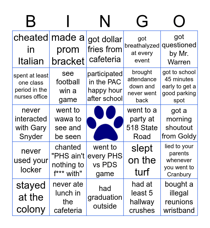 This bingo card has a free space and 24 words: chanted "PHS ain't nothing to f*** with", never ate lunch in the cafeteria, participated in the PAC happy hour after school, stayed at the colony, got questioned by Mr. Warren, cheated in Italian, spent at least one class period in the nurses office, made a prom bracket, went to a party at 518 State Road, went to every PHS vs PDS game, brought attendance down and never went back, never interacted with Gary Snyder, slept on the turf, lied to your parents whenever you went to Cranbury, see football win a game, had at least 5 hallway crushes, got a morning shoutout from Goldy, got dollar fries from cafeteria, got to school 45 minutes early to get a good parking spot, went to wawa to see and be seen, bought a illegal reunions wristband, never used your locker, got breathalyzed at every event and had graduation outside.