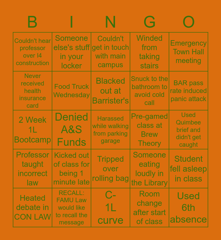 This bingo card has 25 words: Professor taught incorrect law, RECALL: FAMU Law would like to recall the message, Harassed while walking from parking garage, Room change after start of class, Emergency Town Hall meeting, Couldn't hear professor over I4 construction, Someone else's stuff in your locker, Couldn't get in touch with main campus, Pre-gamed class at Brew Theory, Student fell asleep in class, Never received health insurance card, Food Truck Wednesday, C- 1L curve, Someone eating loudly in the Library, BAR pass rate induced panic attack, Heated debate in CON LAW, Denied A&S Funds, Blacked out at Barrister's, Snuck to the bathroom to avoid cold call, Used Quimbee brief and didn't get caught, 2 Week 1L Bootcamp, Kicked out of class for being 1 minute late, Tripped over rolling bag, Winded from taking stairs and Used 6th absence.