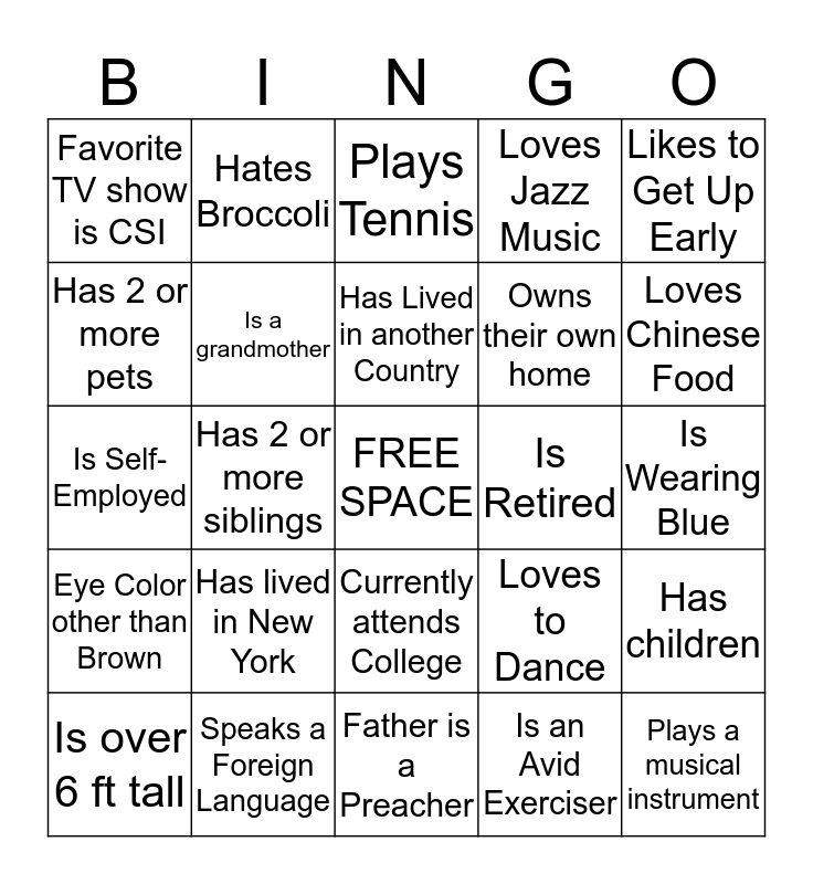 This bingo card has a free space and 25 words: Has lived in New York, Father is a Preacher, Has Lived in another Country, Is over 6 ft tall, Likes to Get Up Early, Favorite TV show is CSI, Has 2 or more pets, Hates Broccoli, Is Retired, Currently attends College, Owns their own home, Is Self-Employed, Loves to Dance, Has children, Is a grandmother, Name Begins with an S, Is Wearing Blue, Plays Tennis, Loves Chinese Food, Has 2 or more siblings, Plays a musical instrument, Speaks a Foreign Language, Eye Color other than Brown, Loves Jazz Music and Is an Avid Exerciser.