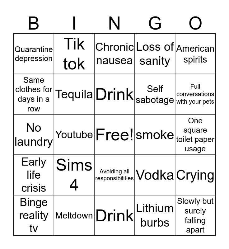 This bingo card has a free space and 24 words: Sims 4, Meltdown, Drink, Binge reality tv, American spirits, Quarantine depression, Same clothes for days in a row, Tik tok, smoke, Avoiding all responsibilities, Self sabotage, No laundry, Vodka, Crying, Tequila, Lithium burbs, One square toilet paper usage, Chronic nausea, Full conversations with your pets, Youtube, Slowly but surely falling apart, Early life crisis, Loss of sanity and Drink.