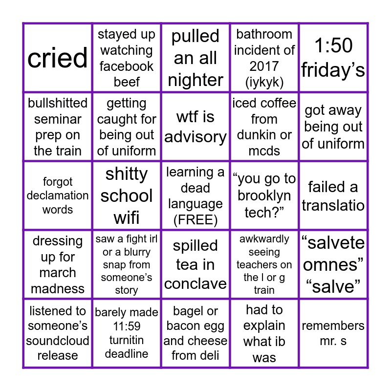 This bingo card has a free space and 24 words: saw a fight irl or a blurry snap from someone’s story, barely made 11:59 turnitin deadline, wtf is advisory, listened to someone’s soundcloud release, 1:50 friday’s, cried, bullshitted seminar prep on the train, stayed up watching facebook beef, “you go to brooklyn tech?”, spilled tea in conclave, iced coffee from dunkin or mcds, forgot declamation words, awkwardly seeing teachers on the l or g train, “salvete omnes” “salve”, getting caught for being out of uniform, had to explain what ib was, failed a translatio, pulled an all nighter, got away being out of uniform, shitty school wifi, remembers mr. s, dressing up for march madness, bathroom incident of 2017 (iykyk) and bagel or bacon egg and cheese from deli.