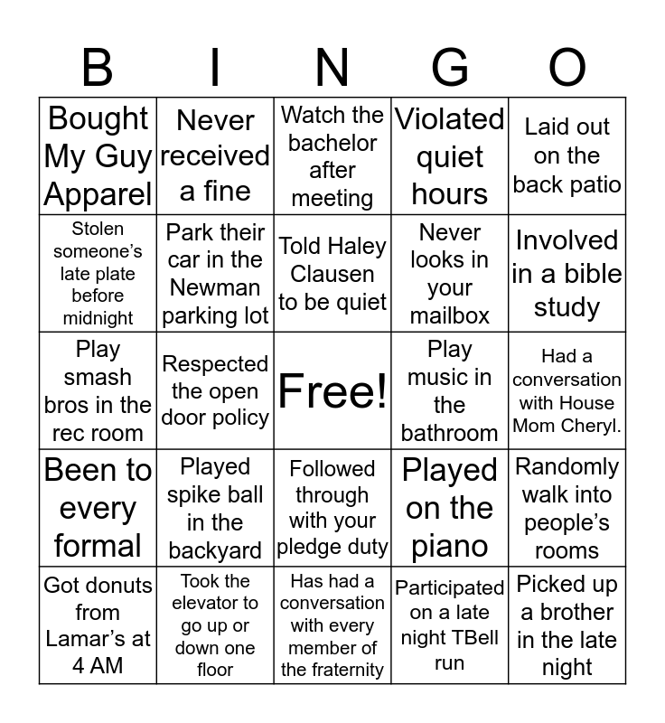 This bingo card has a free space and 24 words: Played spike ball in the backyard, Took the elevator to go up or down one floor, Told Haley Clausen to be quiet, Got donuts from Lamar’s at 4 AM, Laid out on the back patio, Bought My Guy Apparel, Stolen someone’s late plate before midnight, Never received a fine, Play music in the bathroom, Followed through with your pledge duty, Never looks in your mailbox, Play smash bros in the rec room, Played on the piano, Randomly walk into people’s rooms, Park their car in the Newman parking lot, Participated on a late night TBell run, Had a conversation with House Mom Cheryl., Watch the bachelor after meeting, Involved in a bible study, Respected the open door policy, Picked up a brother in the late night, Been to every formal, Violated quiet hours and Has had a conversation with every member of the fraternity.