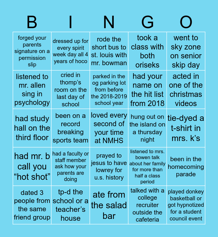 This bingo card has a free space and 24 words: had a faculty or staff member ask how your parents are doing, tp-d the school or a teacher’s house, parked in the og parking lot from before the 2018-2019 school year, dated 3 people from the same friend group, went to sky zone on senior skip day, forged your parents signature on a permission slip, listened to mr. allen sing in psychology, dressed up for every spirit week day all 4 years of hoco, hung out on the island on a thursday night, prayed to jesus to have lowrey for u.s. history, had your name on the hit list from 2018, had study hall on the third floor, listened to mrs. bowen talk about her family for more than half a class period, been in the homecoming parade, cried in thomp’s room on the last day of school, talked with a college recruiter outside the cafeteria, tie-dyed a t-shirt in mrs. k’s, rode the short bus to st. louis with mr. bowman, acted in one of the christmas videos, been on a record breaking sports team, played donkey basketball or got hypnotized for a student council event, had mr. b call you “hot shot”, took a class with both oriseks and ate from the salad bar.