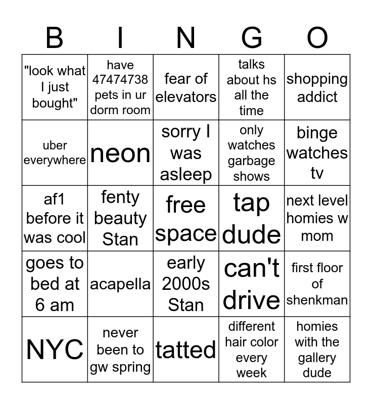 This bingo card has a free space and 24 words: NYC, acapella, sorry I was asleep, different hair color every week, shopping addict, "look what I just bought", have 47474738 pets in ur dorm room, fear of elevators, tap dude, next level homies w mom, af1 before it was cool, neon, can't drive, first floor of shenkman, uber everywhere, never been to gw spring, tatted, talks about hs all the time, binge watches tv, goes to bed at 6 am, fenty beauty Stan, early 2000s Stan, only watches garbage shows and homies with the gallery dude.
