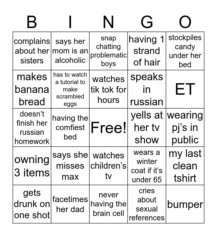 This bingo card has a free space and 24 words: says she misses max, facetimes her dad, watches tik tok for hours, gets drunk on one shot, stockpiles candy under her bed, complains about her sisters, makes banana bread, says her mom is an alcoholic, yells at her tv show, watches children’s tv, speaks in russian, doesn’t finish her russian homework, wears a winter coat if it’s under 65, my last clean tshirt, has to watch a tutorial to make scrambled eggs, cries about sexual references, wearing pj’s in public, snap chatting problematic boys, ET, having the comfiest bed, bumper, owning 3 items, having 1 strand of hair and never having the brain cell.