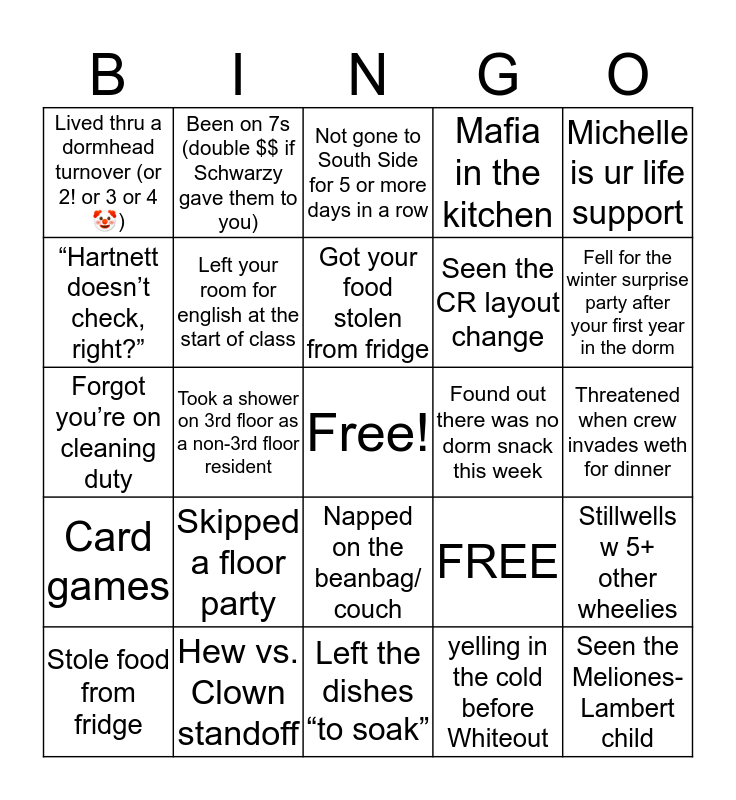 This bingo card has a free space and 25 words: Skipped a floor party, Left the dishes “to soak”, Got your food stolen from fridge, Stole food from fridge, Michelle is ur life support, Lived thru a dormhead turnover (or 2! or 3 or 4🤡), “Hartnett doesn’t check, right?”, Been on 7s (double $$ if Schwarzy gave them to you), Found out there was no dorm snack this week, Napped on the beanbag/ couch, Seen the CR layout change, Forgot you’re on cleaning duty, FREE, Stillwells w 5+ other wheelies, Left your room for english at the start of class, Missed Holi for tea, Threatened when crew invades weth for dinner, Not gone to South Side for 5 or more days in a row, Fell for the winter surprise party after your first year in the dorm, Took a shower on 3rd floor as a non-3rd floor resident, Seen the Meliones-Lambert child, Hew vs. Clown standoff, Card games, Mafia in the kitchen and yelling in the cold before Whiteout.