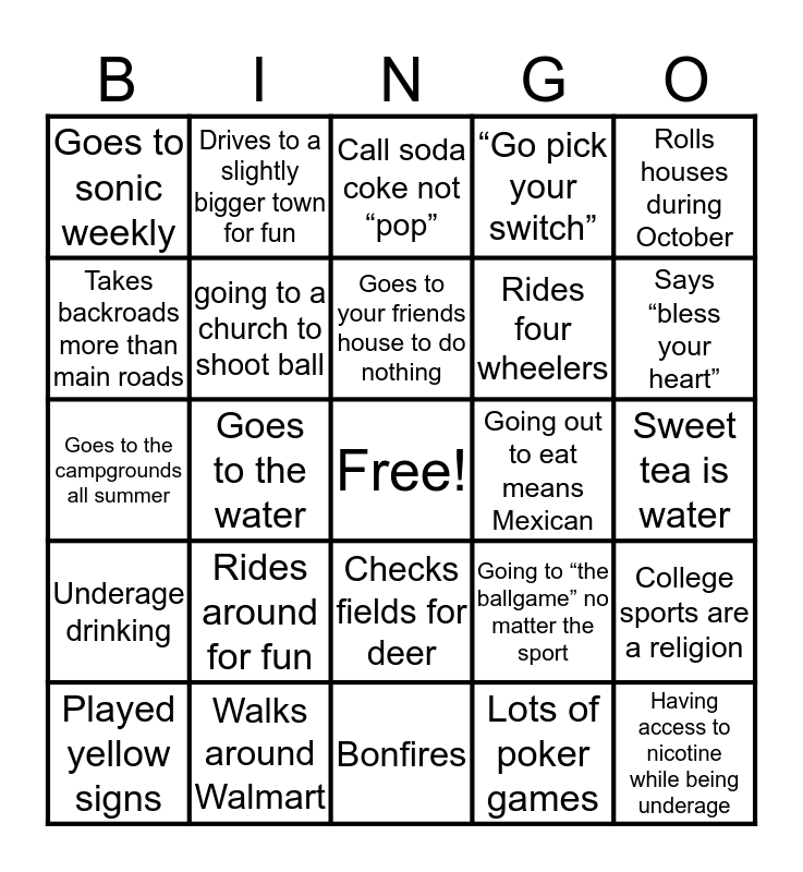 This bingo card has a free space and 24 words: Rides around for fun, Walks around Walmart, Goes to your friends house to do nothing, Played yellow signs, Rolls houses during October, Goes to sonic weekly, Takes backroads more than main roads, Drives to a slightly bigger town for fun, Going out to eat means Mexican, Checks fields for deer, Rides four wheelers, Goes to the campgrounds all summer, Going to “the ballgame” no matter the sport, College sports are a religion, going to a church to shoot ball, Lots of poker games, Sweet tea is water, Call soda coke not “pop”, Says “bless your heart”, Goes to the water, Having access to nicotine while being underage, Underage drinking, “Go pick your switch” and Bonfires.