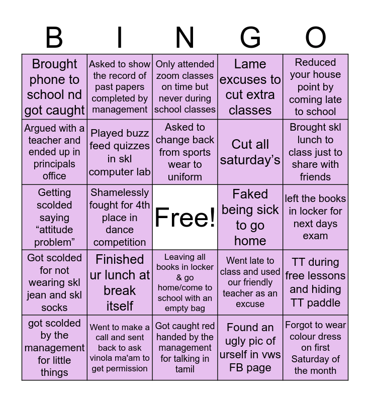 This bingo card has a free space and 24 words: Finished ur lunch at break itself, Went to make a call and sent back to ask vinola ma'am to get permission, Asked to change back from sports wear to uniform, got scolded by the management for little things, Reduced your house point by coming late to school, Brought phone to school nd got caught, Argued with a teacher and ended up in principals office, Asked to show the record of past papers completed by management, Faked being sick to go home, Leaving all books in locker & go home/come to school with an empty bag, Cut all saturday’s, Getting scolded saying “attitude problem”, Went late to class and used our friendly teacher as an excuse, TT during free lessons and hiding TT paddle, Played buzz feed quizzes in skl computer lab, Found an ugly pic of urself in vws FB page, left the books in locker for next days exam, Only attended zoom classes on time but never during school classes, Brought skl lunch to class just to share with friends, Shamelessly fought for 4th place in dance competition, Forgot to wear colour dress on first Saturday of the month, Got scolded for not wearing skl jean and skl socks, Lame excuses to cut extra classes and Got caught red handed by the management for talking in tamil.
