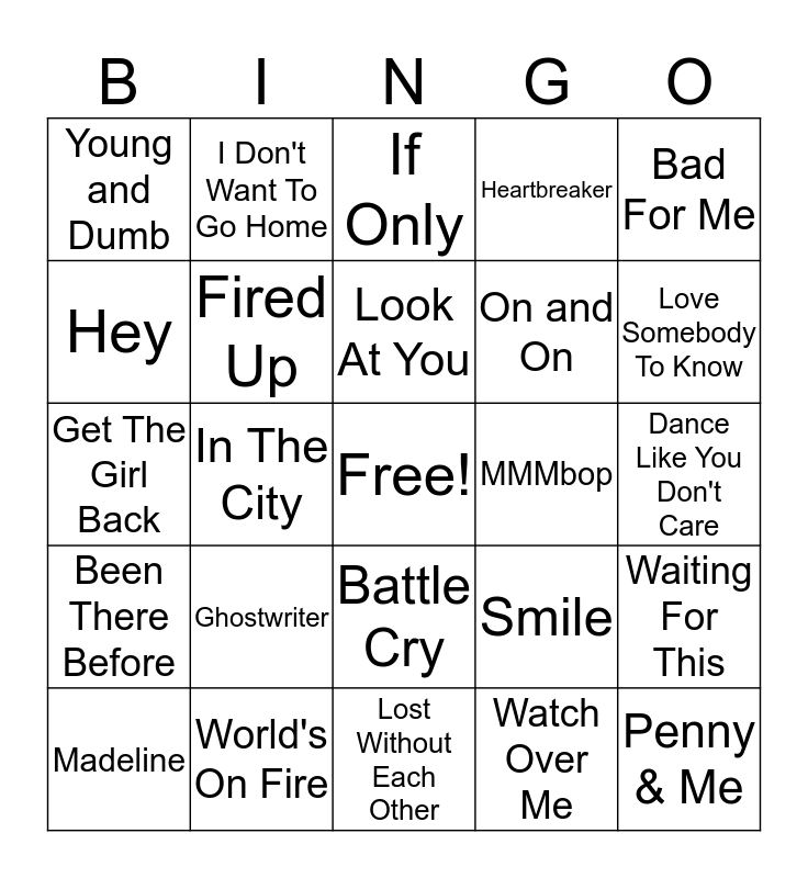 This bingo card has a free space and 24 words: Ghostwriter, World's On Fire, Look At You, Madeline, Bad For Me, Young and Dumb, Hey, I Don't Want To Go Home, MMMbop, Battle Cry, On and On, Get The Girl Back, Smile, Waiting For This, Fired Up, Watch Over Me, Dance Like You Don't Care, If Only, Love Somebody To Know, In The City, Penny & Me, Been There Before, Heartbreaker and Lost Without Each Other.