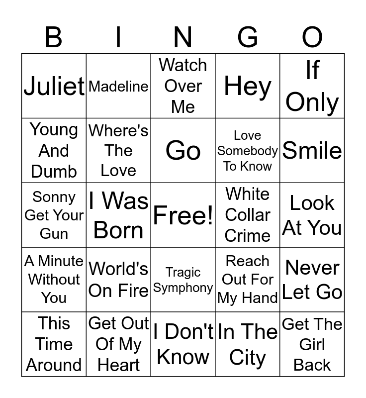 This bingo card has a free space and 24 words: World's On Fire, Get Out Of My Heart, Go, This Time Around, If Only, Juliet, Young And Dumb, Madeline, White Collar Crime, Tragic Symphony, Love Somebody To Know, Sonny Get Your Gun, Reach Out For My Hand, Never Let Go, Where's The Love, In The City, Look At You, Watch Over Me, Smile, I Was Born, Get The Girl Back, A Minute Without You, Hey and I Don't Know.